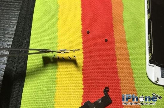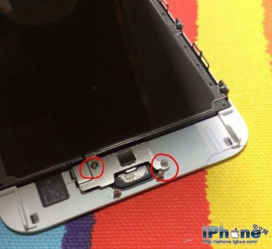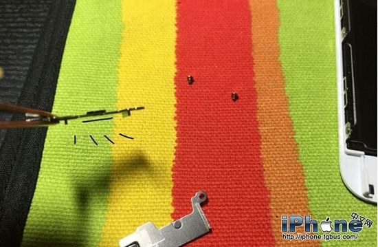 5.把兩個小螺絲擰掉,把鐵片拿下來。現在看到的這個東西叫做“返回鍵鐵片”,這個返回鍵鐵片應該是6s這代機器專有的硬件。