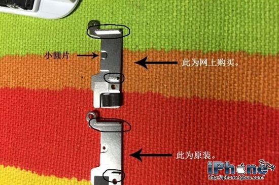 6.從圖中我們可以看到,原裝的鐵片的橫截面比較光滑,網上購買的則比較粗糙,但是並不會造成影響。關鍵在於返回鍵鐵片上面的小圓點。網友bylnan7表示,因為網上購買的鐵片的圓點和鐵片高度太接近,因此會出現Home鍵邊緣沒有反應的現象。把原裝的小圓片放到網上買的鐵片上,就能解決Home鍵邊緣無反應的問題。
