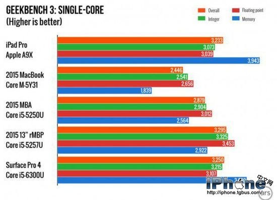 iPad Pro 的性能還超過了12寸 Retina MacBook,MacBook 搭載了英特爾 Core M 雙核處理器,主頻在1.1-1.2GHz 之間。不過,A9X 的芯片性能落後於2015款 MacBook Air 和 Surface Pro 4。