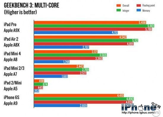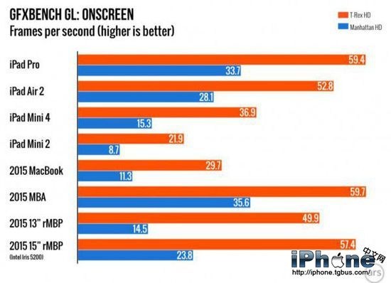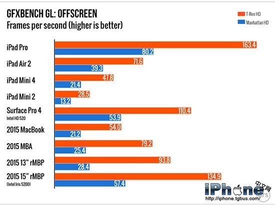 iPad Pro 的顯卡性能令人印象深刻,GFXBench OpenGL 測試顯示 A9X 超過了2015年 15寸 Retina MacBook Pro,這款設備使用的是英特爾 Iris 5200 集成顯卡。被 iPad Pro 顯卡性能超越的設備還包括12寸 MacBook、2015款 MacBook Air、2015款13寸 Retina MacBook Pro 和 Surface Pro 4。