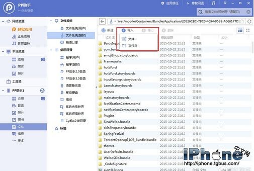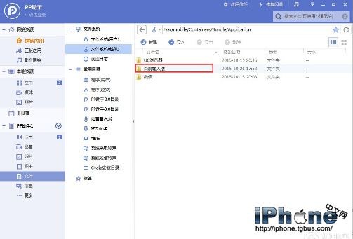 3、設備連接PP助手電腦版,將下載好的文件導入路徑【/var/mobile/Containers/Bundle/Application/百度輸入法/BaiduInputMethodContainer.app】
