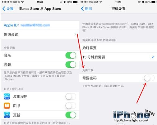 2、再進入“設置>App Store與iTunes Store”,在Apple ID的下面就增加一個“密碼設置”的選項。進入之後,關閉“免費下載需要密碼的選項”即可!以後下載完全免費軟件時,就不需要輸入密碼了。