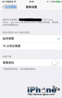 2、再進入“設置>通用>訪問限制>密碼設置”,進入之後,關閉“免費下載需要密碼的選項”即可!以後下載完全免費軟件時,就不需要輸入密碼了。