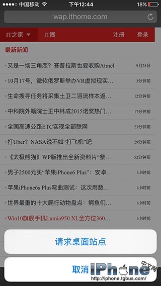 浏覽WAP版網頁時,只需要按住右上角地址欄後面的“刷新”按鈕,在彈出的快捷菜單中,選擇“請求桌面站點”即可。