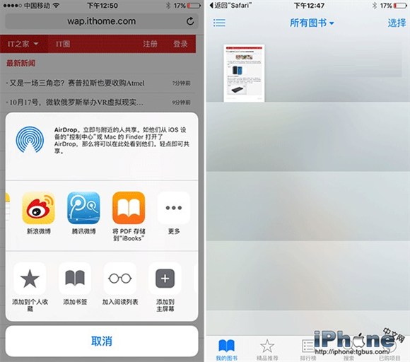 在iOS9中使用Safari浏覽器浏覽網頁時,遇到好的內容,可以直接點擊下方工具欄中間的“分享”按鈕,並從中選擇“將PDF存儲到iBooks”選項,之後網頁內的所有內容都將會被轉化成一個PDF文件,並使用iBooks打開。