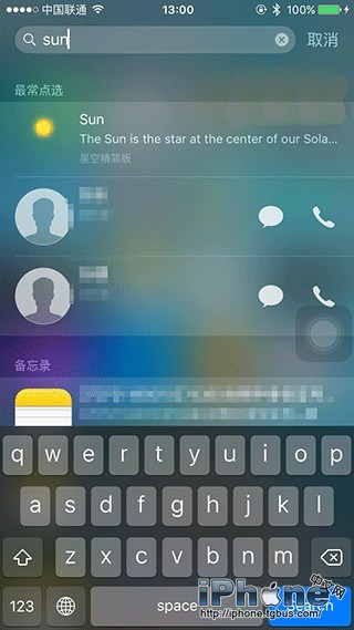 在iOS9系統中,部分應用更新後已經加入了對於“Universal Search”通用搜索的支持,直接在Spotlight搜索欄中輸入內容,即可查找系統以及第三方應用的具體對應信息。例如我們輸入“Sun”,系統就直接給出了星空應用的對應搜索結果。