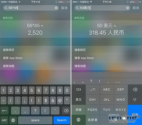 主屏幕下拉開啟Spotlight搜索,直接輸入“56*45”後,即可在下方看到相應的計算結果。如果輸入“50美元”,則會直接顯示根據當前匯率換算後的人民幣數額,例如這裡顯示的是“318.45人民幣”。