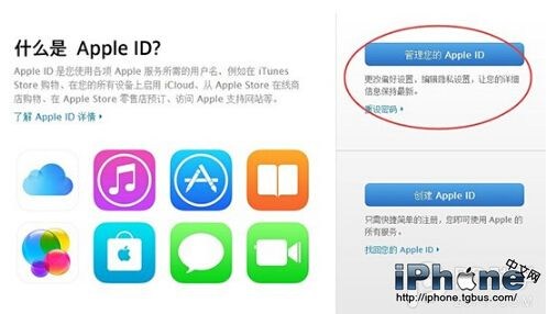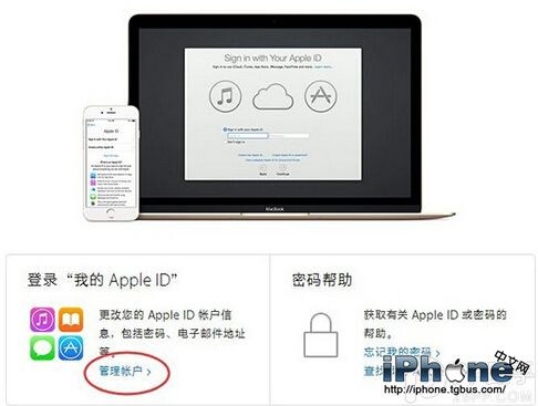 2. 在選擇 Apple ID 之後跳轉的頁面上點擊“管理賬戶”>“管理您的 Apple ID”,輸入 Apple ID 和密碼之後將進入 Apple ID 管理界面。