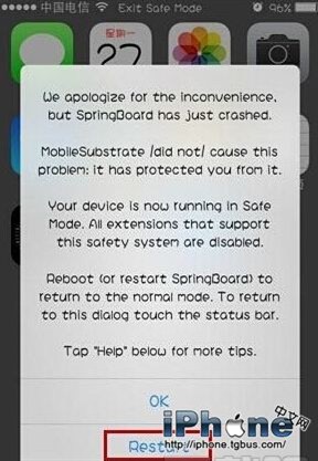 iOS7用戶如果發現設備界面變成灰色,狀態欄上顯示“Exit Safe Mode”,並彈窗提示“We apologize for the inconvenience,but SpringBoard has just crashed. MobileSubstrate did not cause this problem:it has protected you from it.”那麼“恭喜你”,你的設備已經進入安全模式。