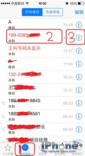 進入“電話”選項後找到“最近通話”選項,然後找到你准備阻止的電話號碼,最後找到紅圈所示數字3標示“i”符號點擊進入。