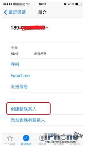 進入"i"選項後,點擊紅圈所示”創建新聯系人”,你可以把名字設置為“A”,這樣方便你快捷操作。