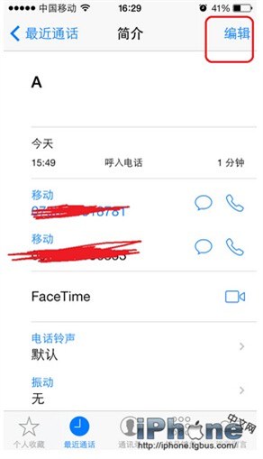 以上的步驟只是說明了對單個電話的阻止,下面我再給大家說一下如何對多個電話或短信的阻止,進入電話選項找到通訊錄中你設置的阻止號碼的名字,比如我的是A,點擊圖片右上角紅圈所示編輯選項進入。