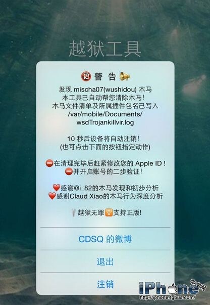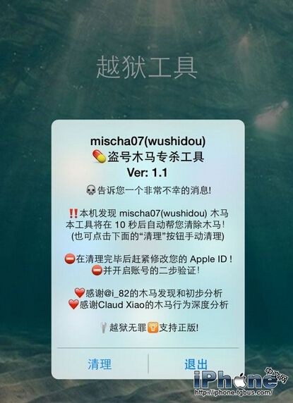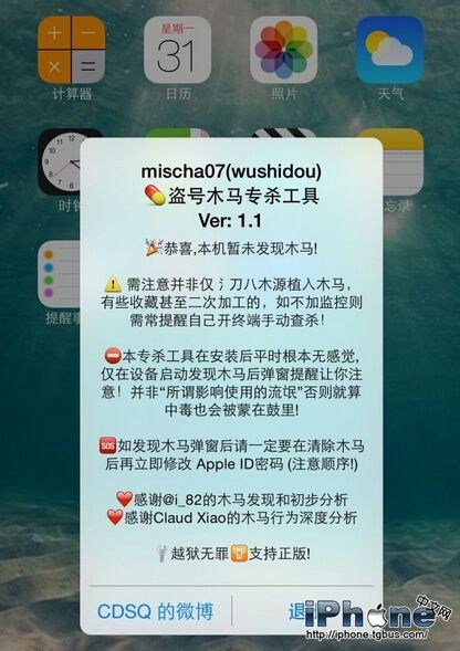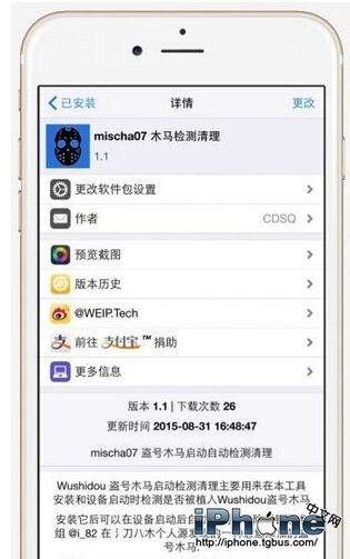 我們已經知道該惡意程序是主要通過刀八木源傳播,一位名叫mischa07的威鋒用戶才是直接的發布者,但也不排除其它的用戶從其它的源頭下載了來歷不明的應用或插件,這些軟件很可能被重新打包並注入病毒。所以在此建議越獄用戶都使用這個由威鋒技術組開發的木馬查殺工具進行進一步的檢驗。