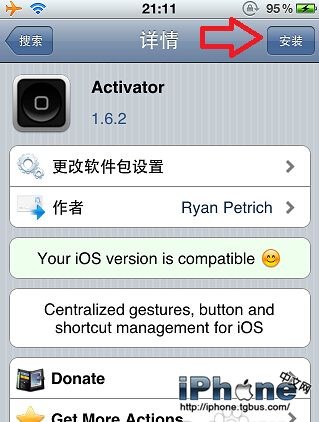 這時候,在搜索框輸入Activator,Cydia將會在已添加的源中搜索相應的結果,點擊其中一條顯示的結果,進入Activator的詳情介紹,注意到右上角有一個“安裝”的按鈕,點擊之後,Cydia就會自動下載並安裝好Activator