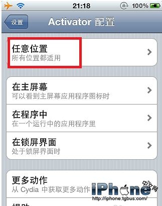接下來看到的就會是Activator的配置界面,先點擊“任意位置”。這表示我們之後的設置都將會在手機屏幕處於任何狀態的時候都能生效