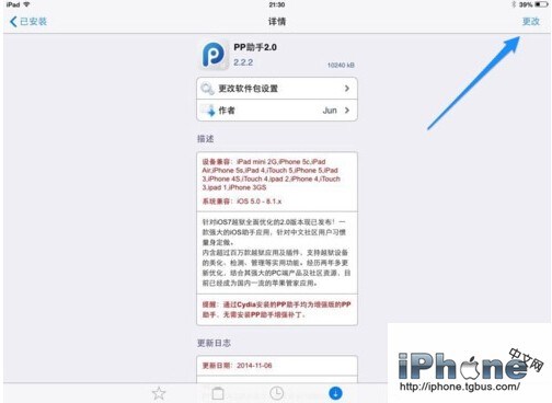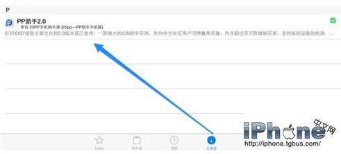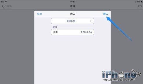 接下來我們請打開設備上的 cydia 應用,在“已安裝”欄目裡,找到pp助手並點擊繼續。