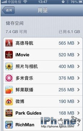 打開【設置】—>【通用】—>【用量】,稍等一會,最上面的存儲空間會顯示出目前的的剩余空間,以及已安裝應用的占用空間。