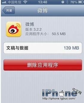 以新浪微博為例,應用程序本身大小50.5MB,文稿與數據139MB,它一共占用了190MB空間。