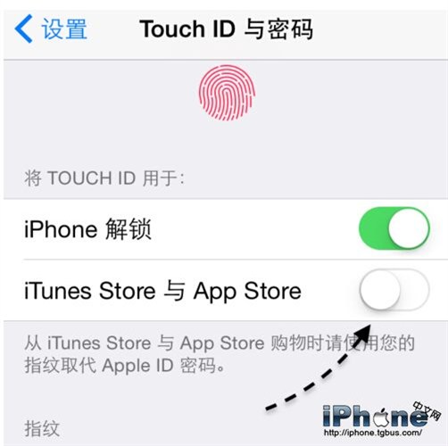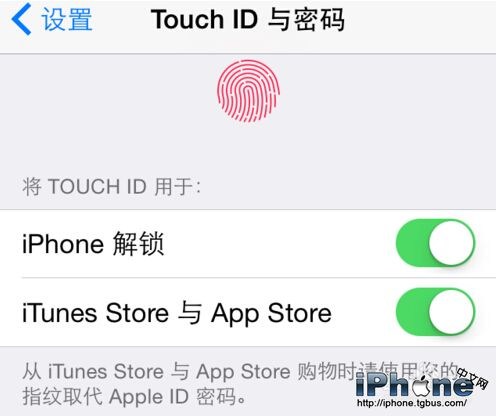 隨後即可看到 iPhone 解鎖選項已經啟動,可以用指紋來解鎖了。此時我們還可以點擊打開 iTunes Store 與 App Store 選項,它可以用指紋購買下載應用軟件。