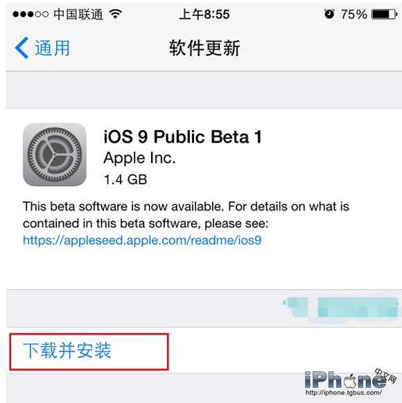 c.安裝配置文件後,最後進入iOS設備的“設置”>“通用”>“軟件更新”,就可以檢測到有新的iOS9公測版可用更新了,我們直接點擊下載並安裝,如下圖所示。