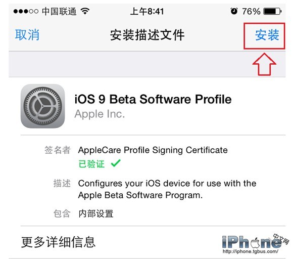 在接下來的安裝界面,點擊右上角的“安裝”,接下您的 iOS 設備將會提示您進行安裝,如下圖所示。