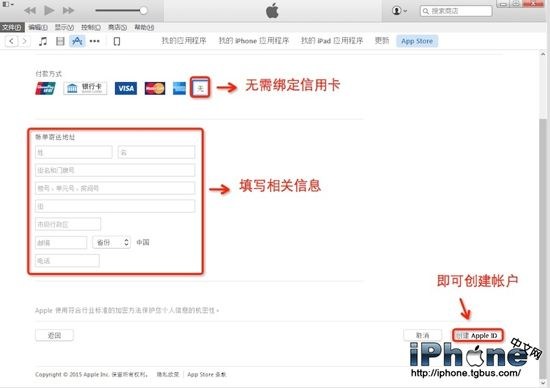 6.付款方式,可以選擇“無”,這樣就不會綁定信用卡。然後填寫相應的信息即可