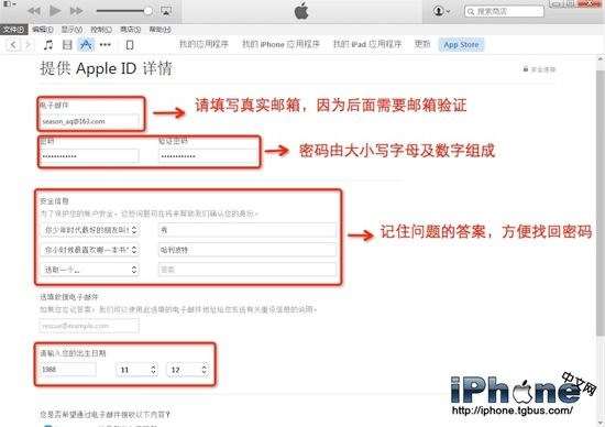 5.填寫創建Apple ID需要的相關信息。請注意郵箱要寫真實的,因為後面需要驗證;密碼需包含大小寫字母及數字;密保問題要記住答案,方便到時候找回密碼。