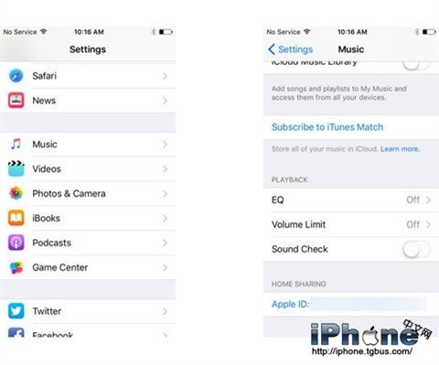 二、接著回到iOS設備,選擇設置-音樂-查看“家庭共享”欄目,看看設備的Apple ID和電腦上登錄的賬戶是否一樣。