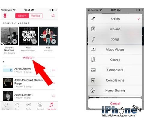 三、打開iOS設備上的“音樂”應用,選擇“我的音樂”,點擊“藝術家”欄目就可以看到“家庭共享”功能了。