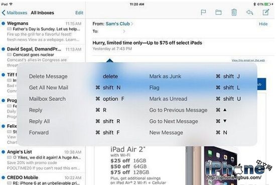 下面小編給大家介紹一下iOS9 郵件應用支持的鍵盤快捷鍵:
