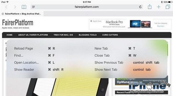 在鍵盤下用戶只要按下連接到iPad的實體鍵盤上的 Command 鍵,就能夠調出一個彈出窗口,顯示可以使用的鍵盤快捷鍵。其中支持快捷鍵數量最多的蘋果 iPad 應用是郵件和移動 Safari,而聯系人和備忘錄則僅支持幾個快捷組合鍵。