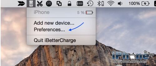 7、在屏幕頂部的狀態欄中可以看到 iBetterCharge 圖標,如果想要對它進行設置的話,請點擊並選擇 Preference 選項,如圖所示