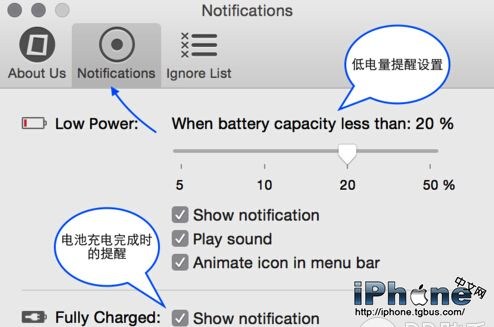 8、在軟件設置的 Notification 欄目中,可以對當電量低於多少時的自定義提醒,也可以選擇當電池充滿電的提醒,如圖所示