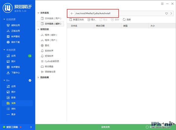 3、將你的手機連接至電腦,用愛思助手將你下載的cydia_****.deb的文件,放到/var/root/Media/Cydia/AutoInstall目錄下,重啟手機一兩次即可完成重新安裝。