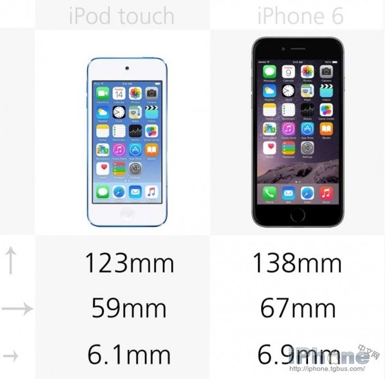 按照今天的主流標准,第六代iPod Touch無疑是一款小尺寸的移動設備。盡管相比較iPhone6已經是屬於小尺寸的了,但是相比較iPod來說高12%,寬14%。同前代相同新款iPod Touch是一款超薄的設備,在厚度上只有6.1mm,相比較iPhone6薄了12%。