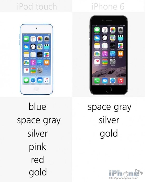 顏色方面,新iPod touch有灰色、金色、深空灰色、粉色、藍色以及紅色六種可選,其中金色、藍色和粉色為新增顏色。而目前iPhone6僅僅只有太空灰、銀色和金色三種顏色供用戶選擇。