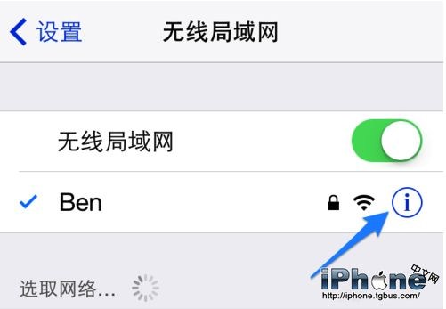 2、點擊當前 iPhone 連接的無線網絡右側的“歎號”圖標,如圖所示