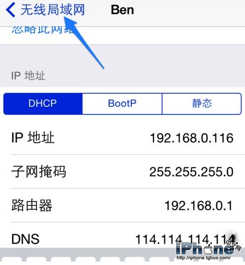 4、在 DNS 一欄輸入 114.114.114.114 或 8.8.8.8 地址,可以換著試一下。好了以後點擊左上角的“無線局域網”按鈕返回,如圖所示