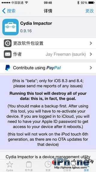Cydia Impactor目前還處於測試階段,支持iOS8.3和iOS8.4設備,目前並不支持iPod touch 6。需要使用的iOS用戶可以在Cydia中搜索下載。