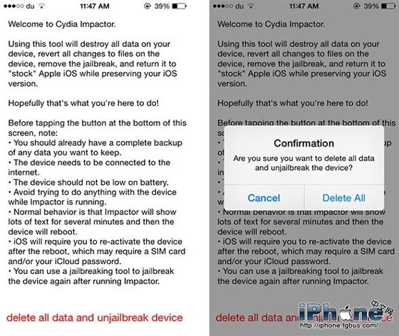 4、閱讀說明後點擊“delete all data and unjailbreak device”(刪除所有數據並恢復設備到未越獄狀態),然後點擊“刪除所有”確認。