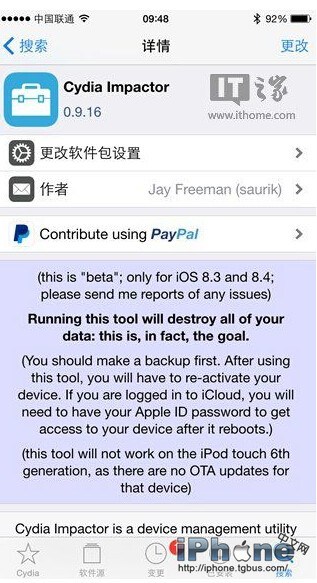 目前Cydia Impactor僅支持iOS8.3和8.4,由於該工具將刪除你所有的設置、應用以及其他內容,因此開始操作前請務必做好數據的備份。該工具執行完成之後,所有的越獄文件都會被刪除,iOS系統也會保留在原有的版本。另外,該工具不支持剛剛發布不久的6代iPod touch。