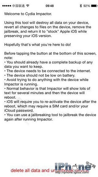 4、運行Cydia Impactor,然後點擊底部紅色的“delete all data and unjailbreak device”字樣,刪除所有數據並取消越獄。一旦操作開始之後,就不要再觸碰你的設備,直到iOS設備上重新出現歡迎界面,按照提示進行重新設置並進行備份恢復即可。