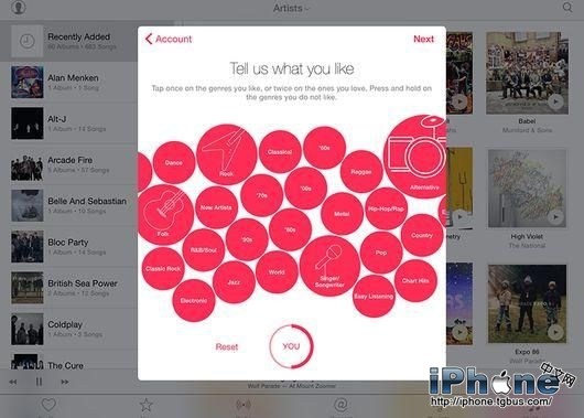 蘋果借鑒了Beats Music中一項非常受歡迎的功能,讓用戶可以告訴Apple Music自己喜愛的音樂風格以及歌手,該服務會據此決定出現在For You選項卡中的內容。當然,用戶可以隨時對此進行修改。