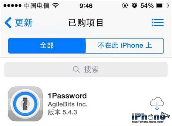 再次回到手機,進入AppStore -更新-已購項目,剛才在電腦端的iTunes上購買的「1Password」就出現在列表裡面了。