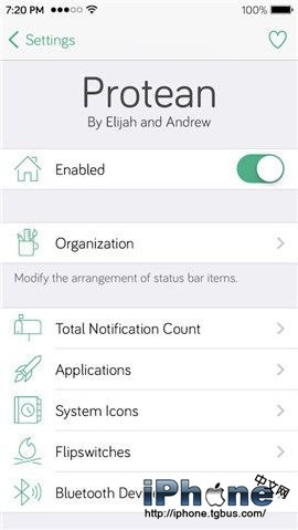 《Protean》是一款功能強大的狀態欄增強插件,其中包括了五大功能:自定義狀態欄圖標的位置、將狀態欄圖標隱藏、顯示App推送圖標、狀態欄提供動作手勢功能以及對Flipswitches的支持。