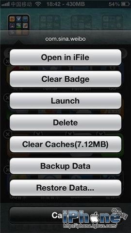 《Icon Tool》可以給 iOS 的圖標帶來更多的實用功能,安裝後,長按主屏幕圖標進入抖動模式,然後快速三擊圖標將會顯示一列菜單。配合iFile將會更加強大:清除角標、運行程序、刪除程序、清理緩存、備份數據、恢復數據。