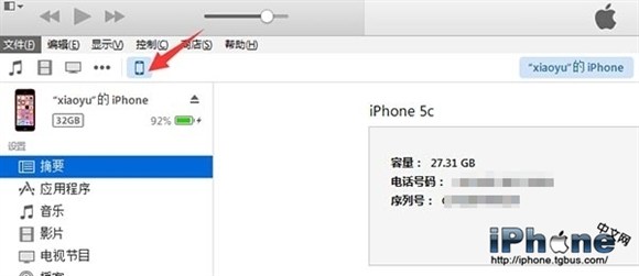 2、運行iTunes並連接設備,點擊左上角圖標進入設備摘要頁。