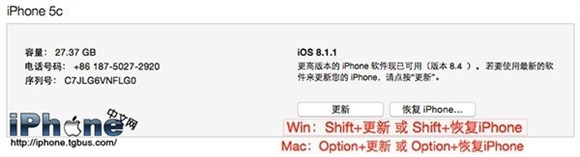 4、然後按住鍵盤上的Shift(Option),同時鼠標點擊iTunes界面的【更新】或者【恢復】按鈕,再選擇對應版本的iOS8.4固件進行升級。