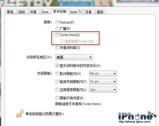 如果你使用上述方法後問題依舊,請嘗試依次進入“iTunes→編輯→偏好設置→家長控制”,在這裡先選擇禁用iTunes Store(圖3),保留“允許訪問iTunes U”,確定後重啟iTunes,再重復前面的操作並取消禁用iTunes Store,如此也能解決“發生未知錯誤-50”問題。
