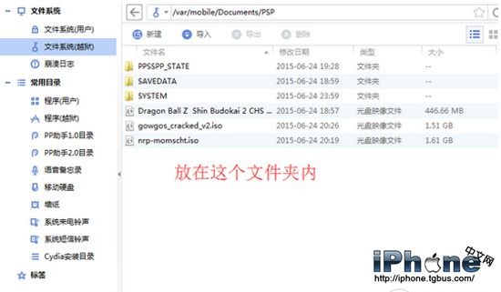 4:打開PP助手或其他同步工具,打開文件系統(越獄),如果沒有文件系統(越獄)這個選項,考慮是否有正確安裝AFC插件;然後將下載完成的PSP游戲放進【/var/mobile/Documents/PSP】目錄下;(注意:只要放ISO文件就可以了,放下載好的壓縮包無法識別)